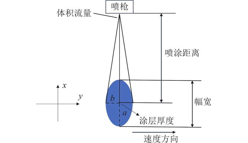 为了保证喷涂质量,在实验轨迹规划之前,针对涂料特性构建机器人喷涂沉积模型,以确定机器人喷涂时的路径宽幅、喷涂距离和喷涂速率等参数. 根据如图7所示的机器人迷彩喷涂设备及喷嘴特点,采用椭圆双