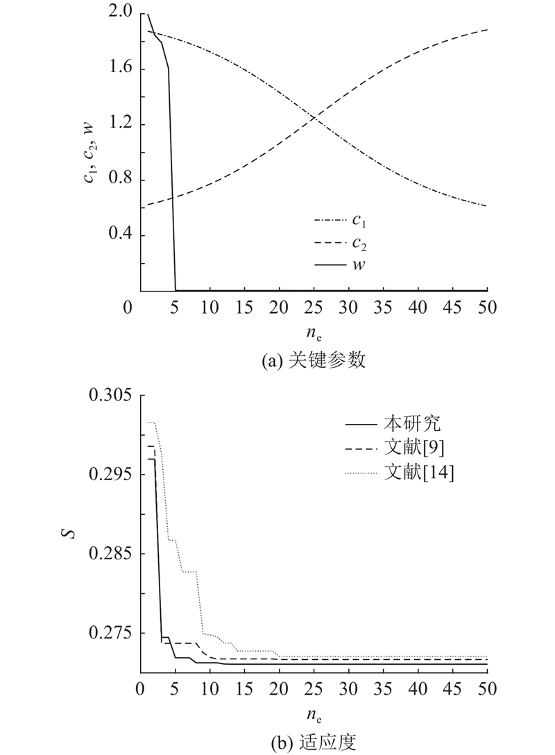 PSO中的惯性权重表示当前速度受前一刻速度影响的程度. 在每个粒子通过调整自己的速度和位置来寻找最优解的过程中,惯性权重决定了粒子速度变化的惯性大小. 当惯性权重较大时,粒子更多地继承前一时刻的速度,优点是有利于粒子在更大的空间范围内搜索,从而增强算法的全局搜索能力,缺点是算法收敛速度慢,不能进行精确搜索. 当惯性权重较小时,粒子对前一时刻速度的继承减少,这有利于粒子在小范围内进行精确搜索,增强算法局部搜索能力,但容易导致算法收敛速度过慢或陷入局部最优. 因此将惯性权重改为动态自适应函数,使算法在搜索前期侧重于全局搜索能力,搜索后期侧重于局部搜索能力,达到最佳搜索效果. 改进后的惯性权重为