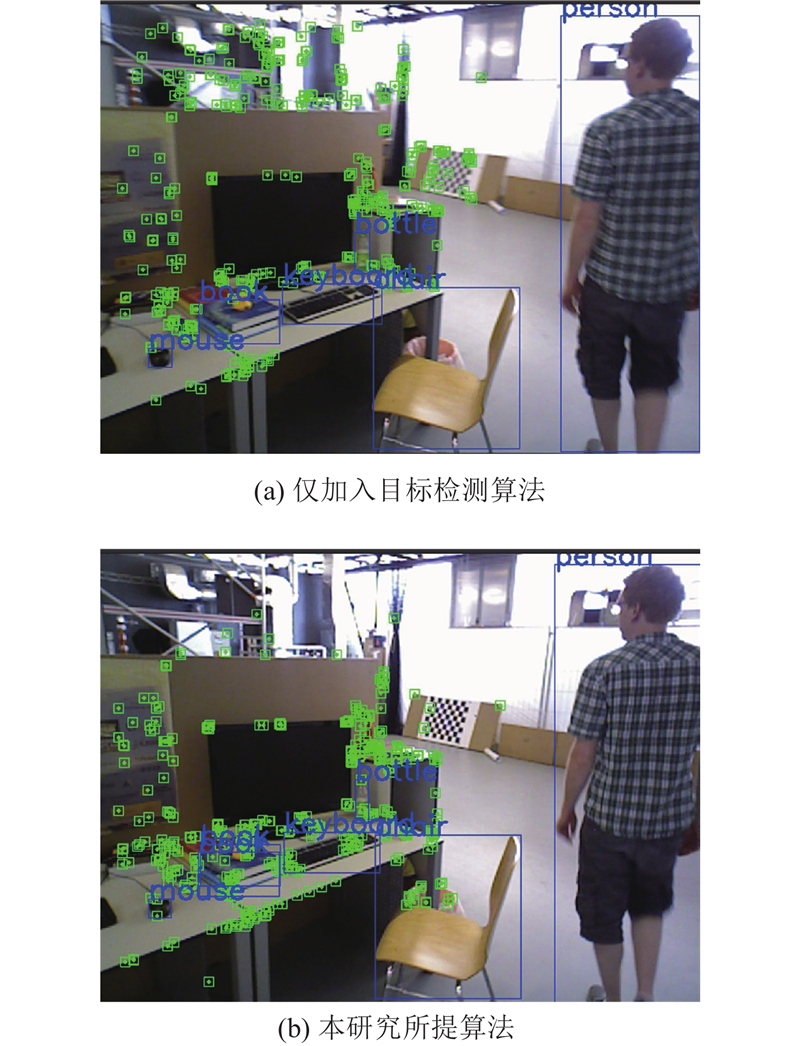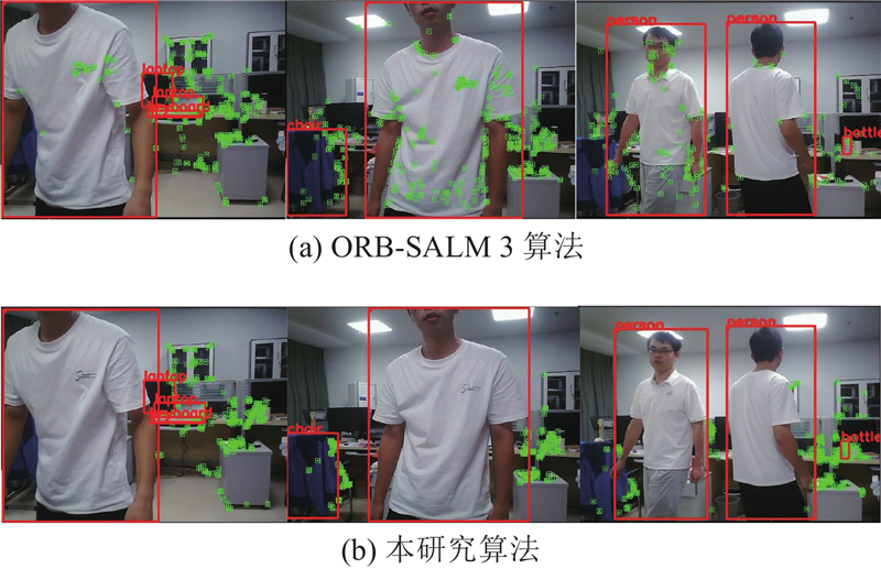 单纯使用目标检测来剔除动态区域特征点,虽然可以保证获取的特征点均为静态特征点,但是会丢失一部分静态特征点. 在进行位姿优化的过程中,采用的特征点的数目越多,获取的估计位姿就越准确. 加入位姿优化的特征点须为静态的特征点,否则将导致估计的位姿出现较大的误差. 本研究所提算法的具体表现如图10所示.