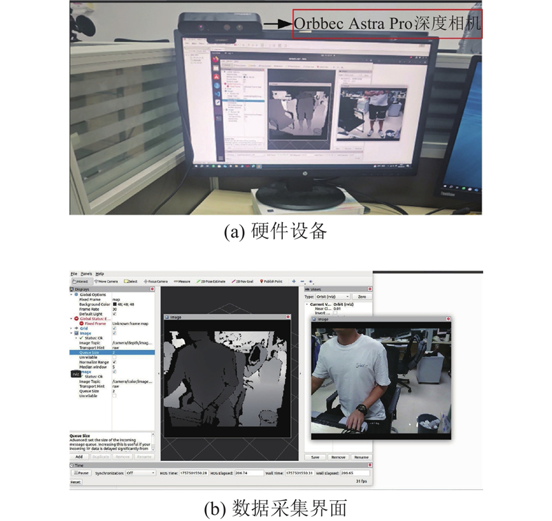 为了测试所提算法在实际场景中的有效性,采用Orbbec Astra Pro深度相机进行相关实验. 实验环境设定于室内实验室场景,场景内包含人、座椅、办公桌、实验设备等常见室内物体,以模拟真实应用场景的复杂性. 场景测试分为数据采集、场景重建与结果分析3个核心流程,相机以640×480 分辨率与 30 FPS 帧率进行数据采集,采集过程如图13 所示. 在数据采集过程中,相机采集数据,在机器人操作系统(robot operating system,ROS)中发布相应话题,由算法订阅这些话题以获取传感器数据. 在场景重建过程中,检测图像中的动态区域,运用双阶段位姿优化算法进行位姿估计. 在相同场景下对比所提算法与ORB-SLAM3的实验效果,结果如图14所示. 经分析验证可知,相较于ORB-SLAM3算法,所提算法对动态环境具有更强的鲁棒性,能够有效保留动态物体内部的静态特征点. 如图15所示,所提算法利用已获取的关键帧构建稠密地图,该稠密地图细节完整,能够清晰地还原场景的三维结构.