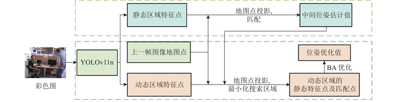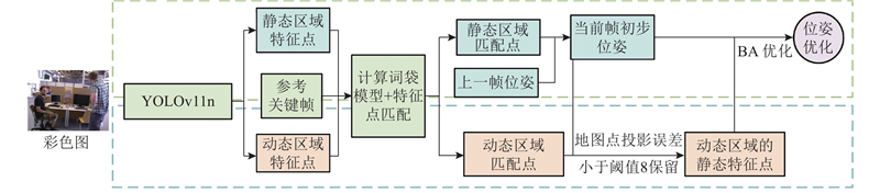 本研究提出融合YOLOv11n目标检测的优化ORB-SLAM3[17]算法. 1)采用基于开放神经网络交换格式(open neural network exchange, ONNX)推理的YOLOv11n目标检测算法获取先验动态区域;2)通过双阶段位姿优化方法筛选出动态区域中的静态特征点,精准剔除动态场景下的动态特征点,同时进行位姿优化;3)利用关键帧中所有位于静态区域的像素点及经筛选得到的动态区域静态特征点执行投影操作生成3D点云,通过点云拼接构建稠密地图.