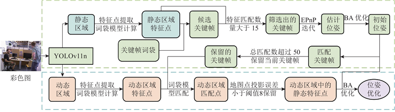 Fig.1 System framework of optimized ORB-SLAM3 algorithm incorporating YOLOv11n object detection