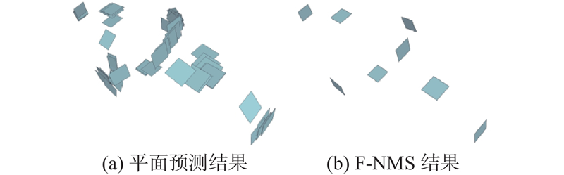 预测面的数量大于建筑点云中实际存在的平面数量,须去除冗余平面. 由于与实际平面对应的多个预测平面非常接近,本研究借鉴目标检测中的非极大值抑制算法,提出F-NMS,并使用该算法去除预测面中的冗余面. 进行基于面的非极大值抑制须计算面的相似度,本研究从建筑点云平面的中心点以及法线来计算2个平面的相似度: