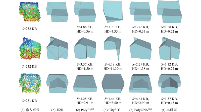 如图8所示为不同方法生成的建筑模型可视化效果对比. 可以看出,对比其他方法,所提方法重建的建筑多边形网格模型所需面片数量最少且与真值的建筑点云高度相符. City3D须调整到合适的参数才能获得比较好的结果,本研究使用City3D默认的参数进行重建. PolyFit和PolyGNN在某些数据上的HD略小于所提方法的模型,但在表达模型所需的面片数量上,所提方法远远小于PolyFit和PolyGNN. 原因是本研究所提方法表达1个平面只需要1个多边形网格,而PolyFit和PolyGNN需要多个多边形网格.