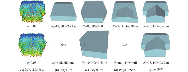 真实的建筑点云数据可能包含更多噪声,为此进行不同方法的抗噪性能测试,结果如图9所示. 可以看出,所提方法在不同程度的高斯噪声中都能够重建出高度保真的多边形网格模型. 随着噪声增多,PolyFit、PolyGNN重建的网格模型质量急剧下降,当σ=0.03时,甚至出现无结果产出,输出为空值的情况. 如表5所示为不同方法在不同程度高斯噪声中的抗噪性能定量评估结果. 在σ=0.02时,所提方法的部分指标略低于PolyFit、PolyGNN,为次优结果;当σ=0.03时,所提方法的所有指标都远远高于现有方法. 随着噪声的增加,现有方法的错误率都显著增加,所提方法的错误率稳定在4.2%~4.6%,这进一步说明所提方法对噪声的鲁棒性.