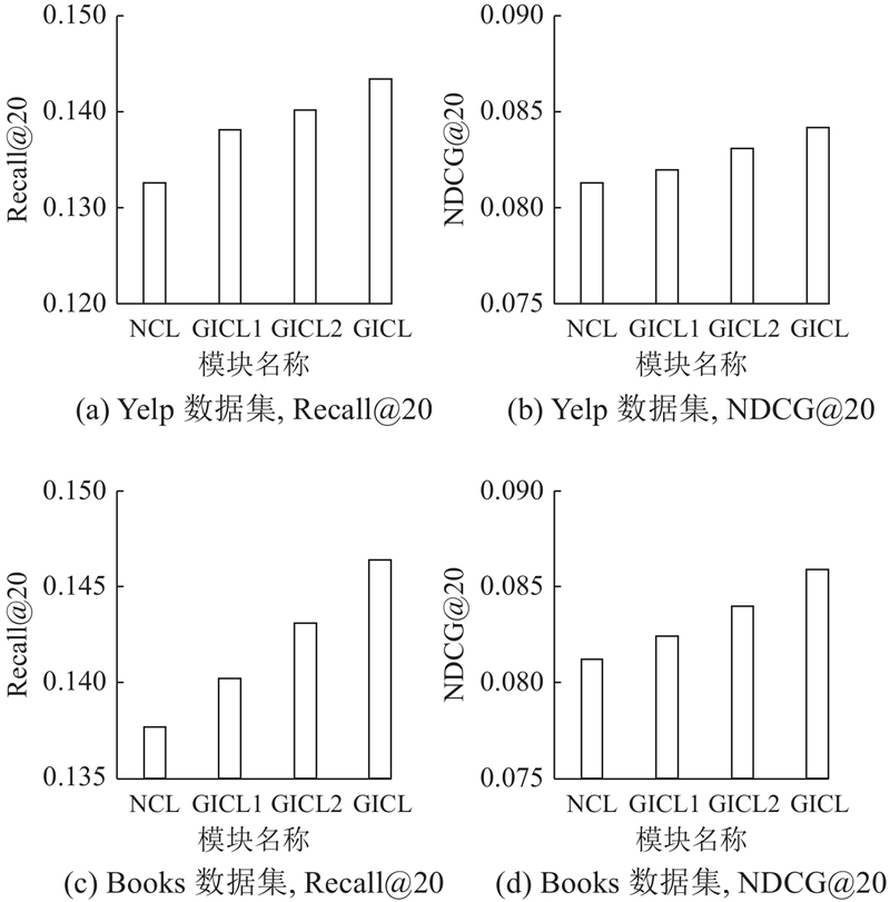 为了验证GICL的有效性,从图协同过滤基础模型和对比学习增强模型2个角度,选取以下具有代表性的基线方法进行比较.1)NGCF[4]:利用交互数据构建图结构,通过图神经网络逐层传播,学习用户和项目的节点特征. 2)LightGCN[5]:简化图卷积操作以减少计算复杂度,保留协同过滤中重要的信息传播机制. 3)SGL[8]:将自监督学习引入GNN中,利用对比学习提升推荐系统的嵌入质量和预测准确性. 4)SimGCL[9]:在图结构上引入随机扰动生成对比样本,舍弃图增强操作,降低计算复杂度,缓解长尾推荐偏差问题. 5)NCL[11]:通过结构近邻和K-means聚类寻找节点的正样本,显式捕获节点之间的关联性. 6)AdaGCL[20]:采用可训练的视图生成器,包括图生成模型和图去噪模型,以创建自适应的对比视图. 7)GraphAug[21]:通过可学习的图采样与重参数化,自适应地生成高质量的对比视图,在聚合时利用混合跳跃图编码器缓解过度平滑问题.