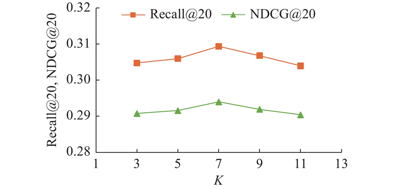 为了探索语义子图数量K对模型性能的影响,在ML-1M数据集上进行实验,实验结果如图5所示. 实验过程中固定模型中的其他参数,测试K变化对实验结果的影响, K的取值范围为{3, 5, 7, 9, 11}. 可以看出,当K从3增加到11,GICL的性能指标曲线呈先升后降的趋势. 分析原因,当K较小时,语义子图数量过少,可能会把一些相似度较低的节点划分到同一子图中,给后续的原型对比学习带来干扰. 当K=7时,推荐性能达到最佳. 如果K再继续变大,将导致子图个数过多,相似的节点嵌入分散在不同的子图上,无法充分利用节点之前的潜在关联.