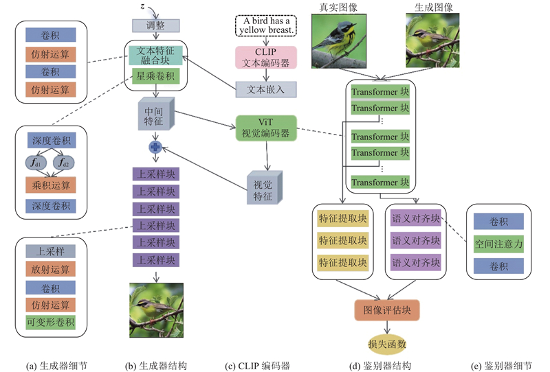 本研究聚焦于优化GAN模型结构,在保持高效生成速度的同时突破传统GAN生成质量的瓶颈,为实时生成和轻量化部署场景提供兼顾质量与效率的解决方案. 研究将针对2大核心挑战展开:1)在不牺牲推理速度的前提下,提高GAN模型的多样化表达能力和语义对齐能力;2)提升GAN模型的细节表现力,缩小与扩散模型的图像生成质量差距. 基于GAN的文本生成图像模型在语义表达方面面临挑战,生成器的潜在空间由于维度有限和特征提取能力不足,往往难以全面表达文本描述的复杂语义信息. MirrorGAN[3]利用反向网络和循环一致性损失约束语义对齐,DF-GAN[4]通过多次仿射学习机制和匹配感知损失增强生成图像对文本语义的全面表达能力. GALIP[5]结合对比语言-图像预训练模型(contrastive language-image pretraining,CLIP)[6]的多模态表达能力增强语义表达,并指导生成器生成全面贴合语义的图像. 本研究在GALIP生成器中加入星模块卷积(star product convolution, StarConv)[7],通过强化对非线性特征的提取能力来提升潜在空间表达能力,结合CLIP实现多样化生成. 为了提升生成图像细节表现,本研究将文本语义信息和真实图像语义信息引入鉴别器的训练过程中,通过多模态语义信息监督强化生成器的细节表现,使生成器在维持语义一致性的同时,显著提升与真实图像在细节层面的契合度;引入可变形卷积(deformable convolution)[8],通过自适应地调整卷积核的采样位置,有效增强模型处理细节信息的能力,使生成图像在细节表现上更加逼真.
