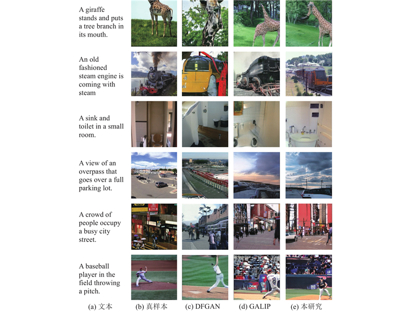如图5所示为不同模型在 COCO 数据集上的图像生成结果. 可以看出,所提模型在多目标复杂场景下也展现出显著优势. 对比第1行图片所提模型生成的长颈鹿不仅在整体形态上贴近真实长颈鹿的姿态,还对花纹和纹理进行精细刻画,有效避免了图像大规模失真的情况;GALIP在该场景下生成的长颈鹿图像存在明显的失真现象. 对比第6行图片,所提模型准确刻画了抛棒球运动员的动态姿态,生成的人物形态自然流畅,未出现GALIP生成中常见的人物扭曲问题. 所提模型对场景中其他人物和物体的描绘同样细致真实,展现出较强的细节处理能力和场景理解能力. 综上所述,相比GALIP,所提模型不仅能够更准确地捕捉复杂场景中的细节和动态,还能生成更具真实和语义一致性的图像,在生成质量上具有显著优势.