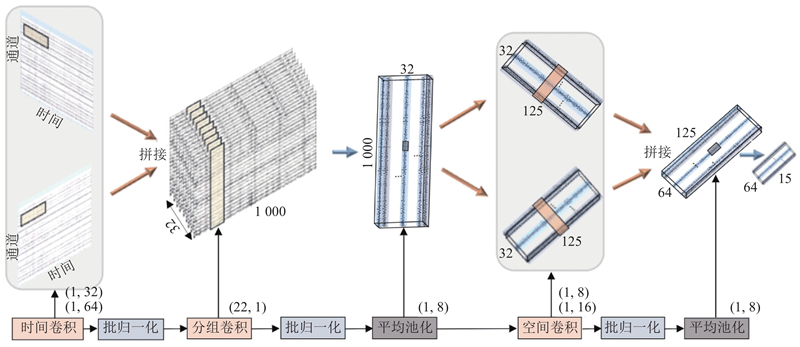 如图2所示,多尺度双流分组卷积模块由3种卷积层构成,包括时间卷积、分组卷积和空间卷积. 1)脑电信号的采用频率为250 Hz,考虑到运动想象相关频段(4~30 Hz)的时域特性,为了提取超过4 Hz的频率相关时间信息,时间卷积层设置了2组卷积核,尺寸分别为 (1, 64) 和 (1, 32),每组卷积核的数量均为16. 这样的设计能够在时间轴上捕捉α和β波段的节律性特征,并最终生成 32 个具有多尺度信息的时间特征图. 通过多尺度卷积捕获信号的层次化时间特性,增强特征表达能力. 将2层时间卷积的输出在通道维度拼接,融合多尺度时间特征,形成包含32个特征图的丰富信息流. 2)中间层采用分组卷积以高效提取特征图的特征关系,输入特征通过大小为(C,1)的分组卷积将32张特征图分为每组2张特征图独立卷积,经批量归一化和指数线性单元(exponential linear unit,ELU)激活函数处理,以引入非线性特性并稳定训练过程. 由池化核大小为(1,8)的平均池化层进一步压缩时间维度,输出的特征图表示为