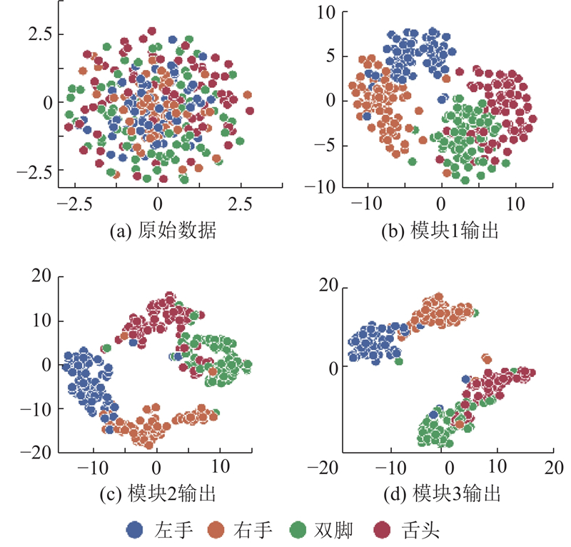 图 7 BCI Competition IV 2b数据集中不同模块的t-SNE特征可视化结果