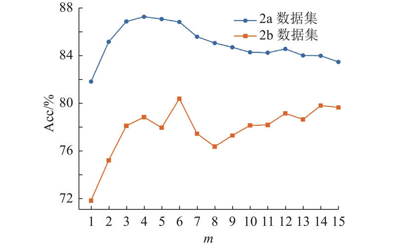 BCI-2a是德国格拉茨理工大学于2008年发布的公共MI-EEG数据集,被广泛用于MI-EEG解码研究,是该领域的基准数据集. 选用脑机接口竞赛(BCI Competition IV)公开数据集中的2a和2b 数据集进行模型的有效性实验评估. 数据集2a包含9名受试者的脑电数据,涉及4类运动想象任务:左手、右手、双脚和舌头. 将每名受试者的实验分为训练集和测试集,分别采集于不同日期,每个阶段包含288次实验,共576次实验. 脑电数据通过22个电极采集,采样频率为250 Hz,对采集的数据进行0.50~100.00 Hz的带通滤波处理和50.00 Hz的陷波处理. 受试者的训练和测试的实验流程包括2 s的注意力集中阶段,随后1 s的任务提示时间和4 s的运动想象过程,结束后有1.5 s的休息时间. 数据集2b包含9名受试者的脑电数据,涉及2类运动想象任务:左手和右手. 实验分为无反馈和有反馈2种条件,共5个记录阶段,总计720次实验,其中前3个阶段数据作为训练集,后2个阶段数据作为测试集. 脑电数据通过3个电极采集,采样频率同样为250 Hz. 受试者的训练和测试的实验流程为受试者前2 s坐在显示屏前呈安静状态,2 s 时听到提示音后做好实验准备;3~7 s时,显示屏随机出现带有方向的箭头,同时被试做相应的想象动作,持续 4 s;受试者有2 s的休息时间,等待下一轮实验的开始. 运动想象相关的脑电活动主要集中在α波段(8~13 Hz)和β波段(14~30 Hz)[20]. 在数据预处理中,2a数据集选取2~6 s的脑电信号作为样本, 2b数据集选取3~7 s的脑电信号作为样本. 使用Hamming窗有限冲激响应(finite impulse response,FIR)滤波器[21]对信号进行1~30 Hz的带通滤波,有效保留与任务相关的关键信号. 采用公共平均参考方法(common average reference, CAR),以减少实验过程中乳突通道记录信号可能受到触变误差的影响.