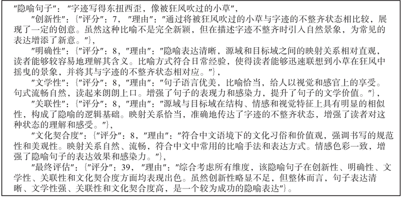 ... 根据Li等[4 ,7 ,20 ] 的总结,隐喻评估主要聚焦于隐喻的恰当性、创造性以及清晰度等维度. 为了确保隐喻句子评估的系统性和客观性,本研究在评估指标和认知语言学的基础上,提出包含创新性、明确性、文学性、关联性以及文化契合度等5个维度的评估指标. 该多维度评估指标在包含以往研究聚焦重点的同时,加入中文隐喻评估中需要注意的有关文化背景以及文学表达的评估维度,旨在尽可能全面衡量中文隐喻句子的质量. ...