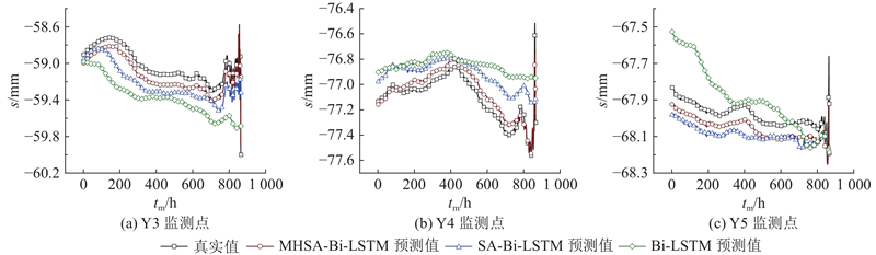 采用较优参数配置下的模型对土体沉降s进行预测,优化器均为Adam,结果如图3所示,其中tm为监测时间. 不同模型对土体沉降数据的预测趋势与真实数据趋势总体相近,表明模型的超参数配置较合理. 对于不同的沉降监测点,Bi-LSTM模型对真实土体沉降趋势的预测显著不足且预测值与实际值间存在较大差异;引入注意力机制后的模型对数据变化趋势的预测接近真实数据;相比于SA-Bi-LSTM模型,MHSA-Bi-LSTM模型的预测值与真实值间的差异更小.