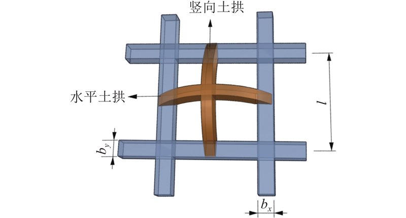 在框架锚杆支护边坡过程中,框架梁沿水平方向和竖直方向呈正交布置,形成多个四边形框架结构. 在土拱效应模型中,相邻纵向框架梁之间产生水平土拱效应,相邻横向框架梁之间产生竖向土拱效应,如图1所示.