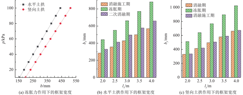 利用式(5)和式(11)分别计算冻胀力p与横梁by、立柱bx的几何尺度关系,如图13所示. 为了揭示土拱效应与框架几何尺度变化关系,选取p=100 kPa计算分析消融施工期—冻胀期—二次消融期3阶段演化过程中框架几何尺度变化关系. 由图14(a)可知,当立柱间距为2 m时,消融施工期水平拱轴线矢高为660 mm;进入冬季后,土体力学参数有所提高,导致冻胀期水平拱轴线拱顶向坡面回缩6 mm,二次消融期水平拱轴线拱顶向坡内扩展5 mm. 由图14(b)可知,当横梁间距为2 m时,消融施工期竖向拱轴线矢高为654 mm,冻胀期竖向拱轴线拱顶坡面回缩5 mm,二次消融期竖向拱轴线拱顶向坡内扩展11 mm. 由此可知,在冻融演化过程中拱轴线变化幅度较小,可不考虑对土拱效应的影响. 由图13(a)可知,随着冻胀力增大,土拱效应越明显,框架宽度随之增加. 由图13(b)、(c)可知,随着框架梁之间的距离增大,土拱效应越明显,框架宽度增加,其中水平土拱作用下框架宽度二次消融期大于消融施工期,冻胀期比其他工况大1.3~1.5倍. 竖向土拱作用下框架宽度二次消融期和消融施工期几乎相等,冻胀期比其他工况大1.5倍. 在工程设计中,框架横梁宽度为550 mm、立柱宽度为500 mm,本次计算方法得出横梁计算宽度为511 mm,立柱计算宽度为440 mm,设计尺寸和计算尺寸相对误差各占7%和12%,设计尺度略有保守.