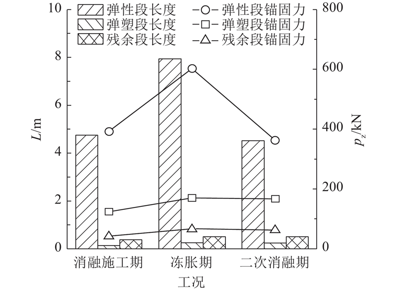 在冻融演化过程中,锚杆锚固力发生变化的关键影响因素是最不利荷载作用下的锚固段有效长度. 如图15所示,依据冻融过程锚固段实测荷载-位移的关系式[30],计算消融施工期、冻胀期、二次消融期冻融演化过程中锚固段弹性阶段、弹塑性阶段及残余阶段的长度L及锚固力pz. 按照消融施工期—冻胀期—二次消融期3阶段循环进行分析,其中消融施工期锚固段弹塑性阶段和残余阶段长度较小,锚固段长度最长,表明以弹性阶段承担锚固力为主;冻胀期弹性阶段、弹塑性阶段及残余阶段相对消融施工期均有所增加,弹性段增长最为明显;二次消融期相对冻胀期弹性阶段长度缩短明显且小于消融施工期,弹塑性阶段及残余阶段间具有不可逆性,因此锚固段长度和冻胀期保持一致. 由于弹性段承担了绝大部分锚固力,从消融施工期、冻胀期、二次消融期分析弹性段长度变化,冻胀期弹性段长度远大于消融施工期,为1.6~1.7倍,为二次消融期的2.0~2.2倍.