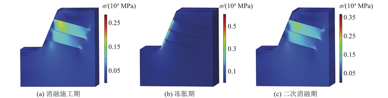 图 16 冻融过程中框架锚杆边坡支护应力云图