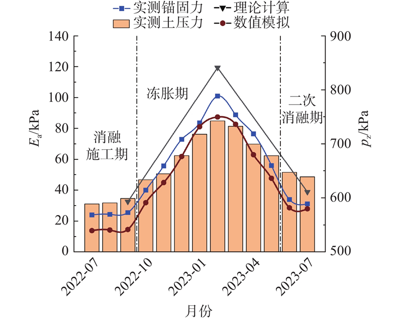 冻融演化过程中现场实测土压力Ea和锚固力pz如图17所示. 分析冻融演化过程中消融期—冻胀期—二次消融期锚杆轴力动态变化可知,理论计算结果总体上略高于实测值,数值模拟略低于实测值. 由误差分析可知,以现场监测数值为基准,理论值和现场监测相对误差为0.60%、数值模拟和现场监测误差为0.52%,属于正常工程可控范围,且变化趋势基本一致,表明该理论计算方法合理可行.