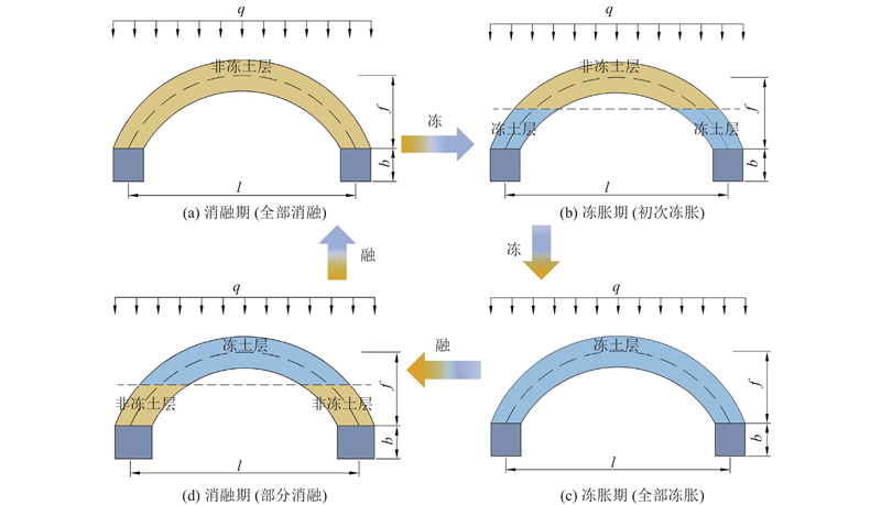 季节性冻土地区最大冻深通常大于1 m[20],造成支护结构出现较为严重的冻胀,因此构建的土拱计算模型按照最大冻胀深度大于土拱矢高来考虑较为客观. 在冻融演过程中,坡面反应最为明显,冬季低温时期冻胀过程由坡面向坡内发展,春季升温时期,坡面由表及里融化,这2个过程恰好相反. 如图5所示,冻胀至消融环过程存在4种土拱工况: 1)在夏季消融施工期,土拱作用区完全处于消融状态:2)刚进入冬季,土拱拱脚部分率先冻胀,拱顶部分为非冻土区;3)进入深冬时期,土拱整体为冻胀状态;4)刚进入春融时期,坡体表面处于消融状态,拱脚部分处于消融状态,拱顶部分处于冻胀状态. 冻融2种工况下坡面岩土强度相差较大,须分析冻土层和非冻土层最不利破坏截面抗剪强度和抗压强度的影响,通过冻融演化过程明确土拱计算模型关键控制参数.