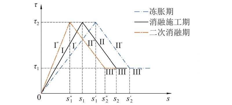 受冻融的影响,框架土拱效应及锚杆锚固力发生变化. 根据土拱效应的变化过程,确定合理的锚固段注浆体与岩土界面的有效长度是保证锚杆支护体系足够安全性的关键. 锚固段注浆体与岩土界面存在3个阶段的应力应变,对应3个长度:锚固段中残余段、弹塑性段和弹性段. 在冻融演化过程中,由于锚固段轴力的不断变化,导致锚固段的3个阶段长度发生变化. 考虑冻融作用下锚固段长度的演化过程,在消融期施工时锚杆锚固力应满足坡体正常的稳定要求,此期间的应力包括残余阶段应力
