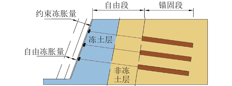 锚杆锚固段与岩土界面的相互作用是确保框锚稳定支挡的关键. 针对锚固段与岩土界面相互作用的研究不少,其中黄明华等[8]从锚杆荷载位移关系出发,建立双指数曲线剪切滑移模型,利用室内模型试验验证模型的合理性. 周炳生等[9]从锚固体界面剪切位移分布曲线出发,推导全长黏结式锚杆锚固段剪应力分布规律. 张耀升等[10]假定锚杆弹性段剪应力沿锚固深度呈现四分之一椭圆弧,推导出注浆锚杆临界锚固长度并结合室内模型试验验证公式的正确性. 李伟等[11]基于冻融循环的三轴剪切实验提出在冻融循环条件下框架锚杆锚固段的轴力和剪应力的解析解. Li等[12]依据岩土体峰值剪切强度和残余剪切强度特征,提出锚固体剪应力均匀分布模式,分析锚固段剪应力的动力学演变过程. Fan等[13]通过设计高、中、低3种强度的拉拔试验,建立拉力型锚杆有效长度和极限承载力的计算方法. Ren等[14]基于锚固段剪切滑移模型,构建适合黏土地层的剪应力分布高斯函数模型. Yuan等[15]通过拉拔试验和微观结构表征研究冻融循环下锚杆的锚固力、锚杆与水泥砂浆黏结强度的变化规律. 高欣亚等[16]开展冬季桩锚结构室外试验,分析土体冻胀对锚杆内力及桩身内力的影响. 上述计算模型均未考虑坡面冻融循环引发锚杆轴力变化影响以及冻融作用下锚杆与岩土界面力学关系,没有解决框架土拱胀缩变形产生锚杆拉力失效的工程问题.