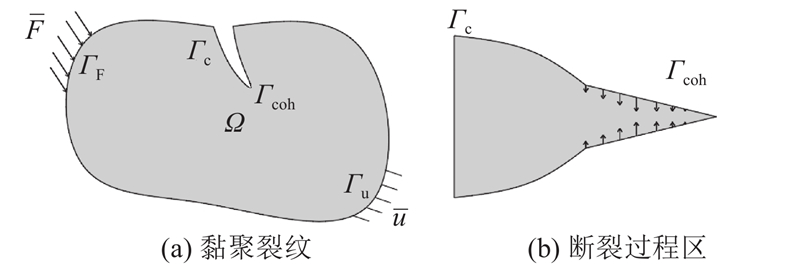 ... 黏聚区域模型通过引入如图1 所示的黏聚区域$\varOmega $ 来模拟裂纹尖端附近发生显著非线性力学行为的断裂过程区$ \varGamma_{\text{coh}} $ ,建立黏聚力(法向或切向应力)与相对分离位移的本构关系[25 ] ,$ \varGamma_{\text{c}} $ 为裂纹区域. 在断裂过程区内,黏聚力抵抗材料在完全分离之前的拉伸或剪切作用,由黏聚力描述材料的损伤行为. 这种方法避免了应力奇异性引起的复杂计算,能够较好地模拟裂纹扩展的物理过程. 黏聚区域模型是唯象模型,模型参数通过对试验结果的反演分析得到,可以很好地表征剪切带微观结构变形引起的宏观变形与能量耗散规律,具有原理简单、容易实现的优点[26 ] . ...
