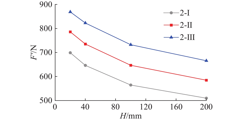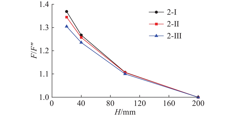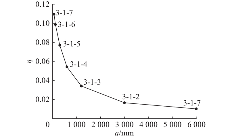 如图11 所示为缺口三点弯梁模型,其中L 1 =1/10 L ,在梁中截面向右1/4 L 2 处预设长度为a 的缺口,网格密度为1000 ×200,保持不同尺寸模型网格数量不变. 荷载施加步骤与2.1节相同. 土体材料为理想弹性体,弹性模量为145 MPa,泊松比为0.35. 黏聚区域模型参数c = 192.9 kPa、G c = 208 N/m、$ {\delta }_{\text{n}}{}_{\text{c}}=0.7\,\,\,\text{mm} $ 、$ {\delta }_{\text{n}}{}_{\text{r}}=2.16\,\,\,\text{mm} $ . 缺口三点弯梁模型工况设置如表3 所示.