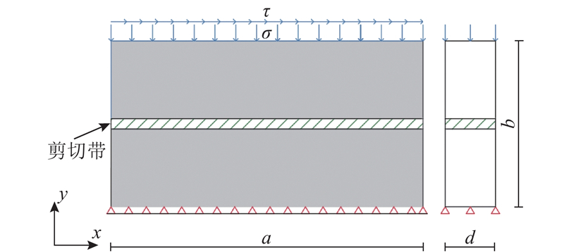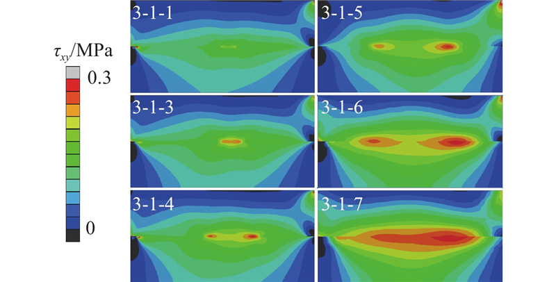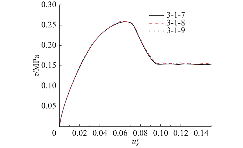 ... 选用工况3-1-7到3-1-9进行异质材料的缩尺直剪模型试验,异质材料的黏聚区域模型参数$ {\delta }_{\text{nc}} $ 、$ {\delta }_{\text{nr}} $ 和G c 同样符合相似准则. 如图19 所示为此3组试验的平均剪应力τ -加载位移归一值$u_x^{\prime} $ 曲线,$u_x^{\prime} $ 为加载位移u x 与模型长度a 的比值. 此组试验力-位移曲线完全重合,未发生尺寸效应. 由此可以证明,尺寸效应由材料的特征长度不随缩尺发生变化引起. 由直剪模型破坏过程可知,加载过程中剪切面上的应力分布不均匀,上、下盒界面及其附近区域的应力明显高于其他区域. 剪切开始时,左右两侧先出现断裂过程区,随着位移荷载施加,左右两侧进入残余阶段,断裂过程区向中部移动. 左右2个部分断裂过程区在剪切面中部汇合时,直剪模型达到结构承载力. 如图20 所示为各工况达到峰值平均剪应力时的剪应力云图,可以观察到小尺寸模型剪切面上的平均剪应力水平远高于大尺寸模型. 在破坏过程中,断裂过程区尖端黏聚力为零,末端达到残余应力,尖端至末端之间剪应力先升高再降低,且应力水平高于其他区域. 当模型剪切面长度L 远大于断裂过程区长度l 时,破坏过程呈现渐进破坏的特征,此现象与凌道盛等[33 ] 进行的试验结果一致. 断裂过程区长度与材料属性相关,不随缩尺发生变化,根据节点应力分析,剪切破坏断裂过程区长度同样为$ l={G}_{\text{c}}E/{\sigma }^{2} $ . 模型尺寸减小,潜在剪切面长度L 随之减小,而断裂过程区长度不变,断裂过程区占潜在剪切面的比值l /L 增大,剪切面上峰值平均剪应力增大,结构相对承载力增大. ...