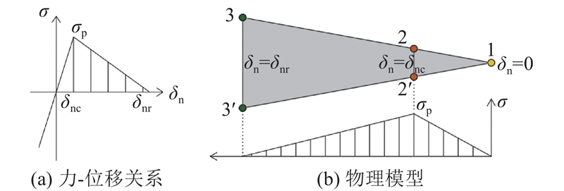 ... 如图2 所示为拉伸破坏模式断裂过程区力-位移关系与物理模型,拉应力$ \sigma $ 由黏聚力c 提供,分为3个阶段. 1)强化阶段:黏聚力随法向相对分离位移$ {\delta }_{\text{n}} $ 线性增加,当达到法向临界相对分离位移$ {\delta }_{\text{nc}} $ 时,拉应力达到最大值$ {\sigma }_{\text{p}} $ . 2)损伤阶段[27 ] :黏聚力随$ {\delta }_{\text{n}} $ 减小. 3)完全分离阶段:当$ {\delta }_{\text{n}} $ 达到法向残余相对分离位移$ {\delta }_{\text{nr}} $ ,黏聚力降为零. 图2 中点2与2′、点3与3′分别代表在初始状态下重合的点. 点1处$ {\delta }_{{\mathrm{n}}}\text{=}0 $ ,点2处$ {\delta }_{\text{n}}\text{=}{\delta }_{\text{nc}} $ ,点3处$ {\delta }_{\text{n}}\text{=}{\delta }_{\text{nr}} $ ,点2至点3之间的区域为断裂过程区,其间的距离为拉伸破坏断裂过程区长度. 拉伸破坏双线性CZM表达式为 ...