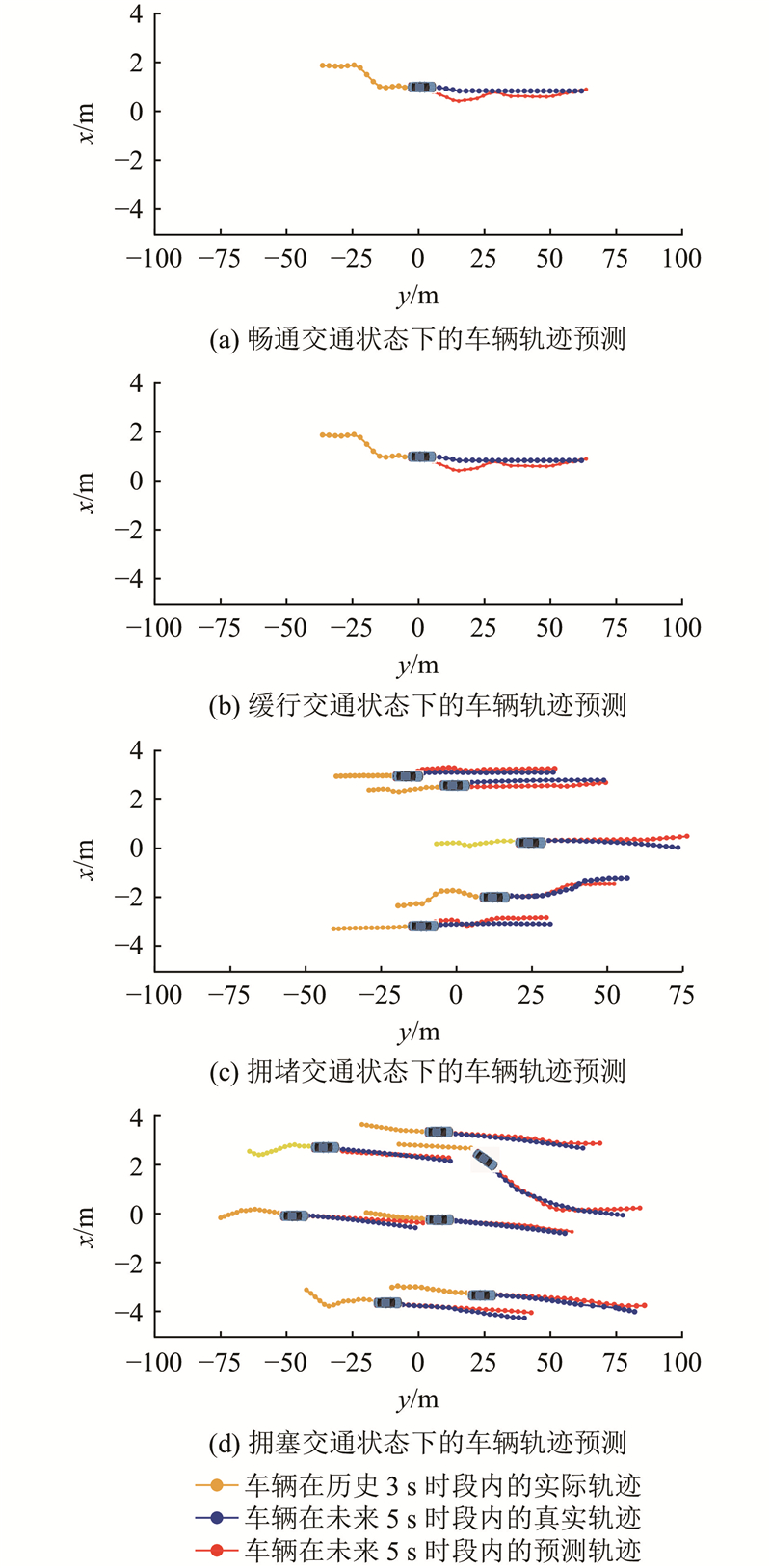 ... 在数据划分方面,2个数据集均按7∶1∶2的比例划分为训练集、验证集和测试集. 每条轨迹被切分为时长为8 s的片段,其中前3 s作为历史观测轨迹,后5 s作为用于预测的未来轨迹真值. 为了保持对比的公平性,遵循Deo等[12 ] 的做法,对每个片段进行2倍降采样,最终的采样率为5帧/s. ...