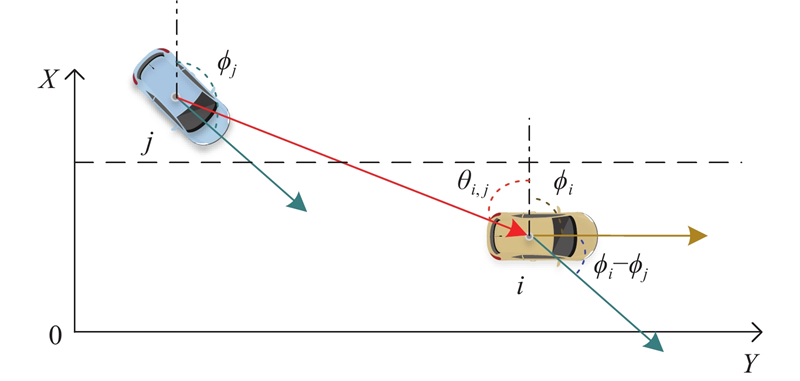 ... 3)车辆之间的交互与运动方向高度相关[44 ] ,前车对后车的影响远远大于后车对前车的影响,而在变道时,目标车道上的车辆对变道车辆的影响更显著[21 ] . 如图3 所示,当车辆j 变道时,其受到目标车道前车i 的影响更大,而直行车辆i 受到变道车辆j 的影响较小. 利用车辆之间运动航向角的差值与车辆间距离角度的相似度,描述运动方向对车辆的交互影响. 利用车辆间纵向距离y 的差值表示车辆前、后的运动方向,修正车辆相对位置对交互的影响,如下所示: ...