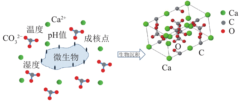... 光合生物诱导碳酸钙沉积是自然界中最常见的形式[11 ] . 研究表明[12 ] ,地球沉积岩与微生物之间存在关联,蓝藻、灌草及硅藻等类微生物在一定环境温度、湿度下,在新陈代谢过程中利用水中溶解的二氧化碳,通过表面设置成核点干预形成晶体矿物[13 ] ,诱导碳酸钙沉积,如图1 所示. 化学反应如下所示. ...