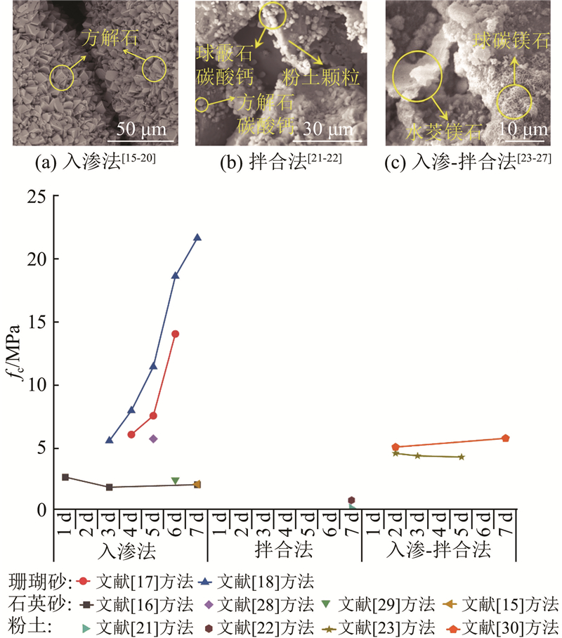 ... 细粒土(如粉土)因孔隙小于10 μm,导致渗透性不足,常采用拌合法或入渗-拌合法加固. 生成物由方解石和球霰石共同组成(见图3 (b)),晶粒尺寸仅为1.0~2.0 μm,粉土颗粒之间未形成有效的桥接作用,导致强度较低. 研究显示,利用拌合法加固粉土的抗压强度为0.1~1 MPa[21 -22 ] . 采用入渗-拌合法,通过预先拌合、多次入渗、引入外加剂等工艺,有效地改善胶结效果,将晶粒尺寸扩大到5~10 μm,包裹粉土颗粒,起到桥接作用(见图3 (c)). 通过添加氧化镁,使碳酸钙与碱式碳酸镁协同胶结[23 ] ,将粉土强度提升至4.5 MPa,符合边坡加固强度的要求[24 ] . 通过改善灌注工艺及土体渗透性的方式,可以提高加固效果[25 ] . 目前,微生物加固主要用于深度小于1 m的边坡加固[26 -27 ] . ...