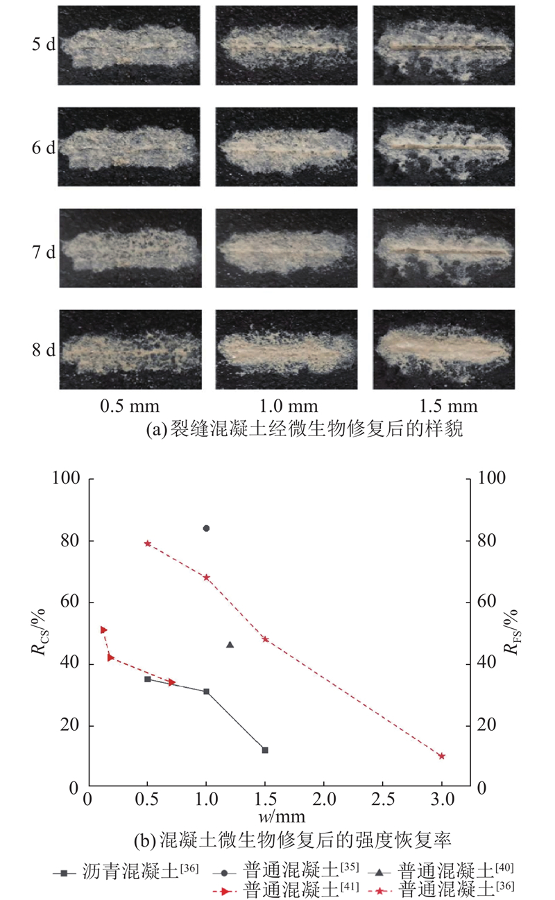 ... 由于早龄期混凝土湿度、孔隙率较高,存在氢氧化钙游离钙离子,微生物矿化环境更好. 当出现裂缝时,混凝土龄期越短,微生物修复效果越好. 开裂时,龄期为3 d和28 d的混凝土强度恢复率从85%下降到46%. 除此之外,pH值、湿度、孔隙率等环境参数对微生物裂缝修复的效果有较大的影响. 通过添加纤维[37 ] 、陶粒[38 ] 、海藻酸钠[39 ] 等载体固定微生物,可以提高50%左右的强度恢复率. ...