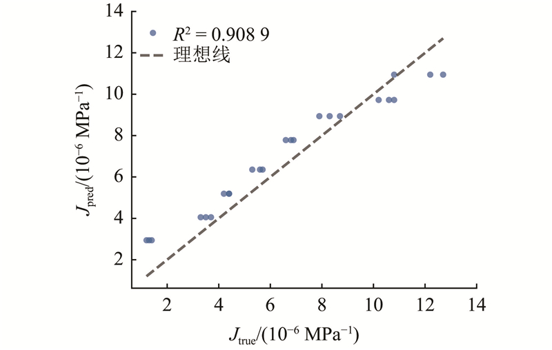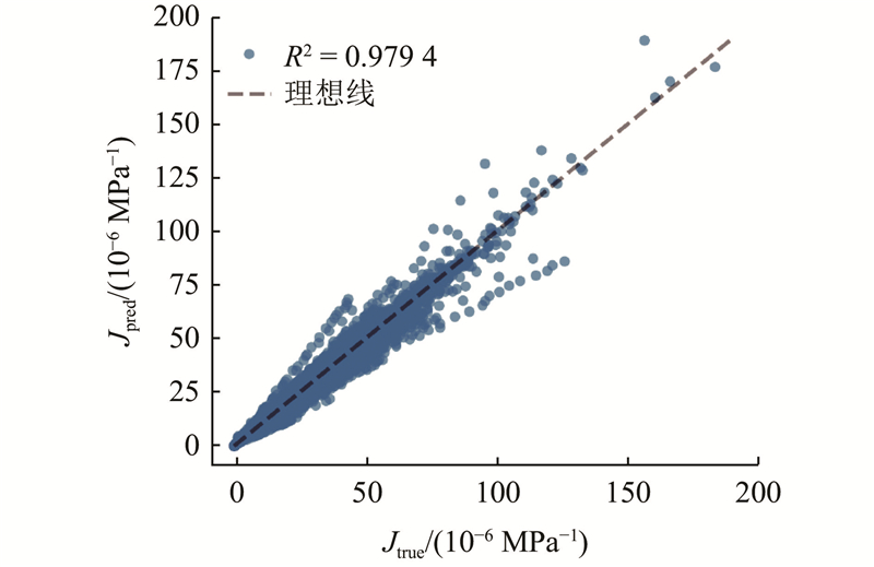在预测结果中可以观察到一些特征:当徐变度较大时,预测值略微低于实测值,这表明模型在预测较大的徐变变形时可能存在一定程度的低估. 这种现象可能与建模过程中未考虑单独的骨料参数有关. 骨料特性对混凝土徐变行为有重要的影响,特别是在大变形阶段,这为未来模型的进一步优化指明了方向.