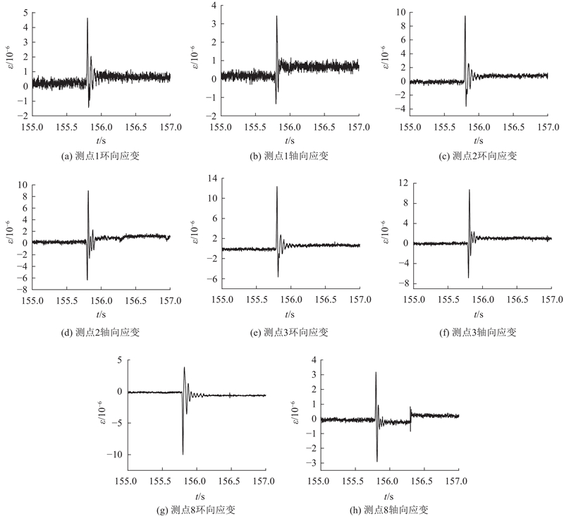 ... 不考虑落石直接刺穿管壁的特殊情况,埋地油气管道在落石冲击下的失效模式主要为局部屈曲变形(椭圆化)[14 ] . 管道动态应变为本试验的主要监测项目,通过在管道内壁粘贴不同方向的应变片进行测量. 试验中所用的应变片为单轴50 mm,120 Ω型号的应变片,接1/4桥,经屏蔽线缆与DH8302动态信号采集仪相连,采样频率为2 kHz. 应变监测点共有8处,4处在管道中部截面沿环向分布,4处在管道顶部对称于中部截面沿轴向分布. 每处监测点分别布置环向应变片和轴向应变片共16个,具体如图1 所示. 对于采集到的应变时程曲线,利用低通滤波法去除高频噪声. 截止频率设为1 kHz,远大于一般埋地钢管的振动主频[21 -22 ] ,保留了有效信息. ...
