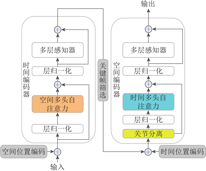 ... 根据文献[13 ]可知,时间编码器能够有效地对关键特征空间编码器的输出进行时间特征的提取,从而进行跨帧人体运动建模. TTE的设计结构如图3 的右半部分所示. 具体来说,将帧选择器的输出$ {{\boldsymbol{x}}}_{1} $ 添加可学习的时间位置嵌入$ {{\boldsymbol{E}}}_{{\mathrm{Spos}}}\in {\mathbf{R}}^{1 \times J\times c} $ ,为每一帧编码索引相关的信息. 带有M 层的时间编码器利用时间多头自注意力(temporal-MSA)模拟整个序列的帧对帧的依赖关系. 在该阶段,每个时间编码层的令牌号是N ,这是经过关键帧时空编码后的输入序列的长度. 时间编码器的时间建模过程如下: ...