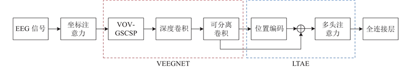 ... EEGNet[16 ] 是专为脑电信号分类设计的轻量级神经网络,其架构精巧,通常由3层卷积结构构成,依次为二维卷积层、深度卷积层和可分离卷积层. 为了进一步提高模型对脑电信号的空间特征提取能力,将EEGNet中的原始二维卷积层替换为VoV-GSCSP模块[17 ] . 该模块融合了GSConv和CSP的优势,相较于传统卷积,在特征学习方面展现出更强大的表达能力,同时保持了较高的计算效率,未显著增加计算成本. ...