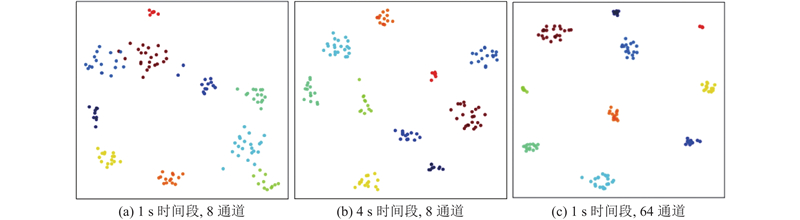 1 1 19 15 98.22 97.74 — — — — CNN-LSTM[8 ] 1 1 16 64 99.58 99.58 0.410 0.410 1927.50 —多任务对抗学习[22 ] 1 64 99.20 — — BGWO-SVM[23 ] 1 23 94.13 — — EPI-CGAN[24 ] 1 64 99.02 — — PCA+SVM[25 ] 2 64 99.91 — — DNN[26 ] 4 64 97.81 — — GCT-EEGNet[27 ] 1 32 98.90 0.004 0.17 ResNet18[28 ] 1 64 99.59 — 11.25 提出方法 提出方法 提出方法 提出方法 提出方法 1 1 1 1 1 15 16 19 32 64 98.52 98.63 98.86 99.48 99.97 0.001 0.001 0.001 0.001 0.000 0.29 0.29 0.29 0.30 0.32 Ashenaei等[21 ] 使用COH提取特征,输入CNN分类,该模型在1 s时间段、19通道和1 s时间段、15通道的配置下,准确率分别达到98.22%和97.74%,本文方法在相同通道下分别提高了0.64%和0.78%. Sun等[8 ] 使用CNN-LSTM模型在64通道的配置下实现了99.58%的高识别准确率,比本文方法在64通道下的识别准确率低0.39%. 虽然文献[8 ]算法在16通道下的识别准确率略优于本文方法,但其结合了LSTM层,将参数量增加到1927.5 × 106 ,这增加了过拟合的风险,而本文模型的参数量远远小于该模型,且EER更低. Alyasseri等[23 ] 使用BGWO-SVM在23通道的配置下取得94.13%的准确率,相比之下,本文方法在更少通道数下表现更优. Ortega-Rodríguez等[25 ] 采用主成分分析结合SVM进行脑纹识别,在2 s时间段、64通道的配置下取得了99.91%的准确率. 本文方法仅在1 s时间段便能达到更优的识别效果,显示出更高的效率和实用性. Akbarnia等[26 ] 使用DNN对预处理脑电信号进行脑纹识别,在4 s时间段、64通道的配置下实现97.81%的准确率,明显低于所提方法的识别效果. Alshehri等[27 ] 提出轻量级GCT-EEGNet网络进行脑纹识别,在1 s时间段、32通道的配置下实现98.90%的识别准确率,虽然文献[27 ]方法采用的参数量仅为0.17×106 ,但识别性能低于本文方法. Li等[28 ] 构建多视图融合模型,使用ResNet18进行分类,在1 s时间段、64通道的配置下实现99.59%的准确率,参数量为11.25×106 . 相比之下,本文模型在参数量远小于文献[28 ]模型的情况下,识别准确率与其相当. Jin等[24 ] 采用EPI-CGAN模型,该模型在64通道下的准确率达到99.02%. Zhou等[22 ] 将LFCC特征与多任务对抗学习相结合,在64通道下取得99.20%的准确率. 这2种方法使用较多的通道数,且分类效果不及本文所提方法. 通过在Physionet-MI数据上的分类性能比较,验证了本文所提方法即便在参数量较少的情况下,仍能取得较好的分类效果. ...