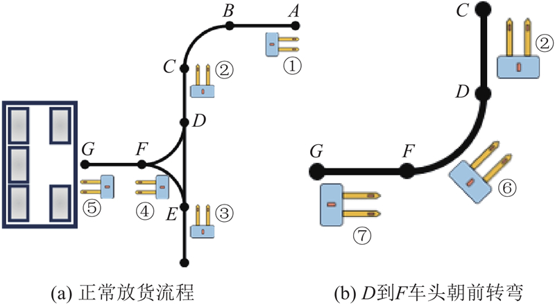 当AGV进行货物搬运作业时,在任务过程中将着重优化侧向跟踪误差,须提高权重a. 在接近任务点前着重优化角度偏差,须提高权重β. 在经由多次实验研究后,当AGV在任务过程中时,a与β分别设置为0.72和0.28;当AGV接近任务点时,a与β分别设置为0.34和0.66.