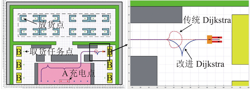 针对仓储物流整体环境须保持秩序性、单舵轮AGV转弯需要一定的转弯半径以及传统Dijkstra算法面对大型网图时搜寻效率低的问题,提出基于站点与航向约束的改进Dijkstra算法,流程如图2所示. 思路如下. 1)在整体静态环境地图中规划出整体仓储物流中的各点位,部署期望路径站点,除非必要的倒车入库路径,其余均以车头朝前的运行方式. 2)在全局地图中设置站点位置和与相邻节点的期望运行方向后,构建全图信息. 提出采用构建子图的方式,根据起点和终点的状态信息构建不同的子图,极大地减少了路径搜索时间. 3)构建航向约束扩展子图,防止出现传统Dijkstra算法中不考虑运行方向,即图1(b)的实际与期望位姿不符的情况.