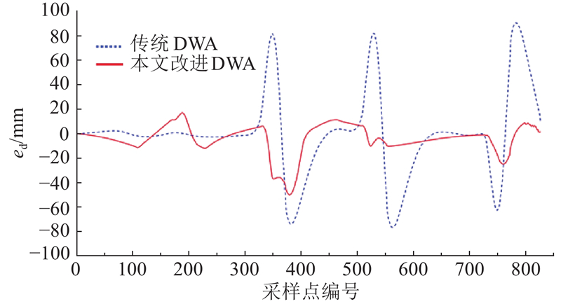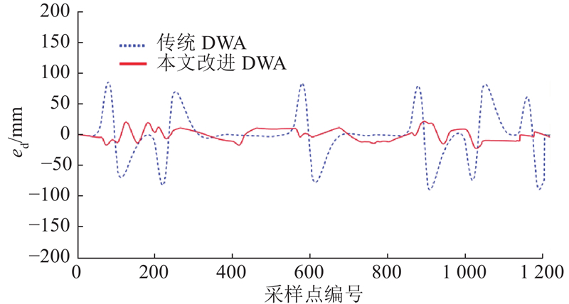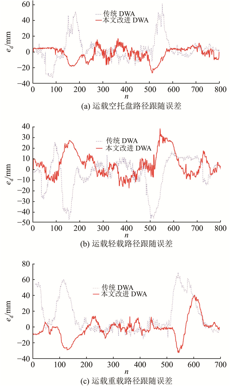 搭建整体仓储导航环境进行实验. 选取空托盘、轻载和重载3种货物作为取货对象,分别部署传统DWA算法和改进的DWA算法. 通过多次实验,分析无障碍物路径跟随时与期望路径的侧向跟踪误差,如图14所示.