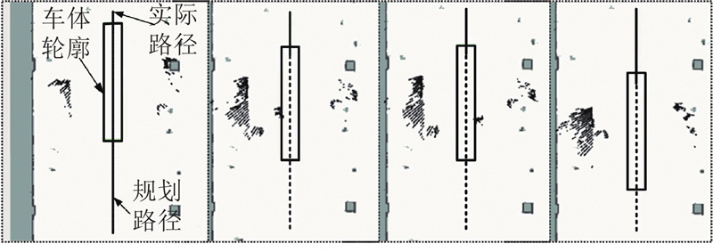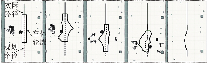 在前向路径放置2个静态障碍物,AGV运行时检测到障碍物停车,超过设定时间后障碍物依旧存在于前向路径,进入静态障碍物的避障逻辑判断,更新避障路径后恢复运行,跟随更新后的轨迹. AGV运行路径如图16的粗实线所示. 其中,粗实线为已实际运行路径,虚实线为规划路径,粗实线包络多边形为前向局部路径车体轮廓.