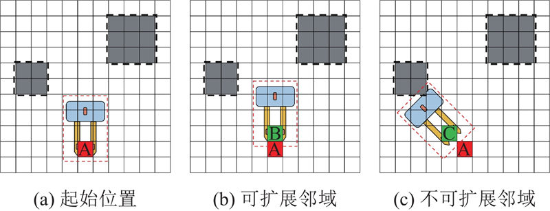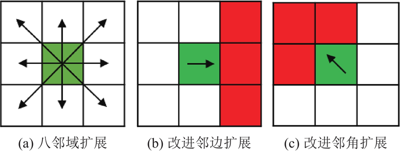 结合父节点的矢量方向,获取其方向正前方与斜前方左右45°的三邻域节点作为扩展节点,如图4(b)箭头右列的三邻域格、4(c)箭头所示的左上角3个域格所示,防止AGV规划出锯齿型路径,以降低路径跟随精度.