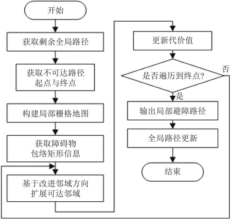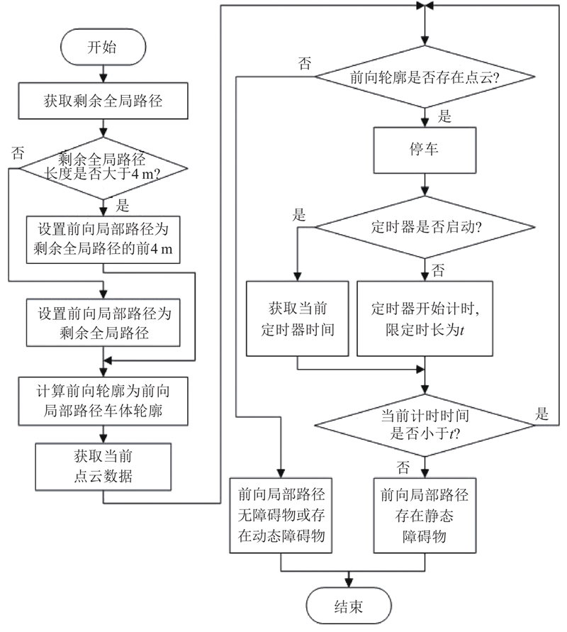 3)前向轮廓存在点云后停车,设定计时时间t. 在t时间内障碍物离开前向轮廓,判定为动态障碍物,则恢复运行,无须避障. 若在t时间后前向轮廓存在障碍物,则判定前向局部路径存在静态障碍物,更新避障路径,恢复运行.