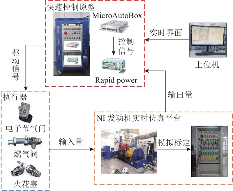 试验验证平台通过在闭环回路中使用实际物理实体替代控制器或控制对象,更真实地再现发动机运行过程中的信号传输干扰,以及电磁元件、执行器可能存在的动态延迟效应. 这种实验方式不仅能够更准确地模拟发动机在不同工况下的工作状态,还可以灵活调整实验参数,以适应复杂多变的运行环境. 该平台具备高度的实时性和可调控性,可以在实验过程中动态调整温度、压力、转速等关键变量,以模拟发动机在不同工况下的真实运行状态. 此外,该平台试验周期短、重复性高、成本低,广泛用于发动机性能验证、控制优化和故障诊断[19].