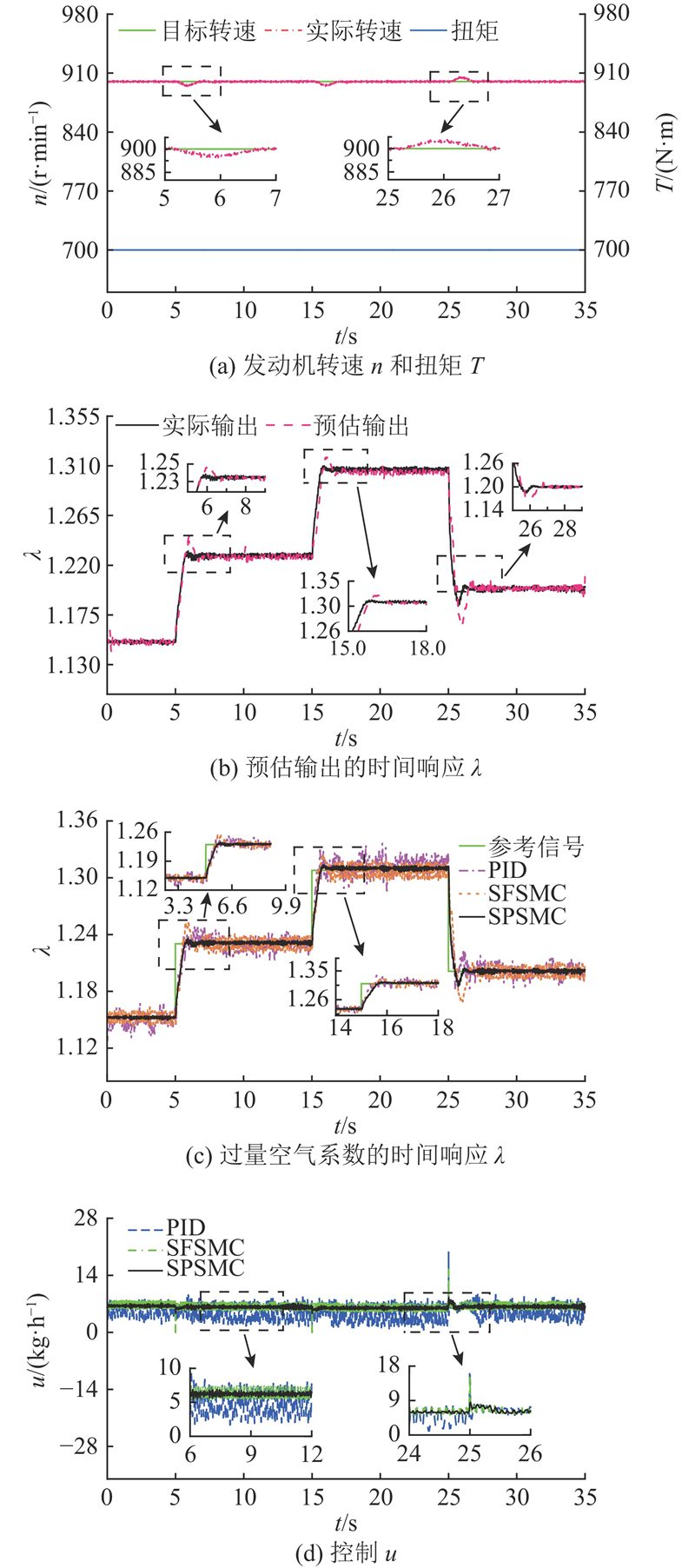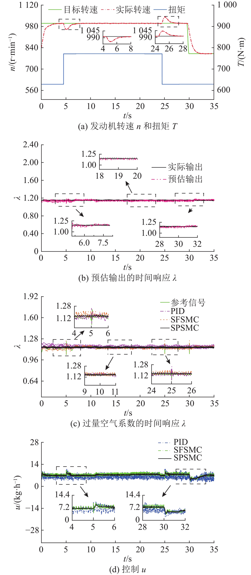 案例1:验证预定义时间控制器的稳定性能,参考信号是过量空气系数的阶跃变化. 在发动机转速分别设置为900 r/min、负载扭矩为700 N·m的稳态工况下,使用改进的Smith预估器对过量空气系数进行预估效果的分析,将提出的预定义时间空燃比控制策略与PID控制器和SFSMC控制器进行对比.
