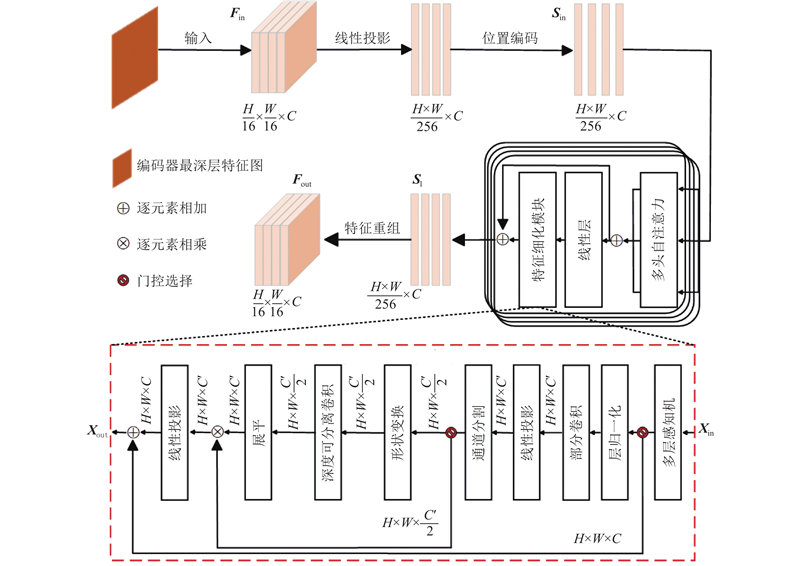... (b)通过数据依赖的门控抑制冗余信息,将增强后的特征$ \boldsymbol{X}' $ 沿通道维度均等分割为2部分$ {\boldsymbol{X}}_{1} $ 和$ {\boldsymbol{X}}_{2} $ ,其中$ {\boldsymbol{X}}_{1} $ 表示后续特征调值,$ {\boldsymbol{X}}_{2} $ 表示生成门控信号以抑制冗余. 利用门控机制对特征进行化简,首先将通道分割后的$ {\boldsymbol{X}}_{2} $ 从序列形式转换为二维特征图,再恢复为序列,引入局部性信息;其次使用深度卷积$ \mathrm{DWConv} $ [22 ] 提取轻量级局部空间特征,为门控信号注入局部空间上下文信息,生成门控权重;然后将增强后的特征$ {\boldsymbol{X}}_{1} $ 与门控权重逐元素相乘,动态抑制冗余通道的特征响应,保留通道重要信息. 门控机制$ {\boldsymbol{X}}_{\mathrm{r}} $ 的实现过程可表示为 ...
