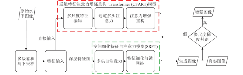 ... 水下图像存在色彩伪影和细节模糊问题,若直接采用Transformer网络进行增强,往往会因密集注意力机制[19 ] 对特征全局关系的计算,导致对水下图像不相关区域部分的注意力权重分配不合理,从而降低水下图像增强效果. 本研究提出基于特征细化与注意力增强重构的水下图像增强算法,该网络的整体结构如图1 所示. 针对Transformer网络中产生的特征冗余问题,设计SRFT与CFART模块构建特征优化和注意力增强协同框架,减少特征冗余,降低噪声,实现水下图像的增强. 针对传统前馈网络中深层Transformer编码的全局语义特征存在通道冗余的问题,SRFT模块将特征细化模块嵌入前馈网络,通过“增强-抑制”双阶段通道精炼策略,先增强高价值通道特征,再采用门控机制减少特征冗余,有效降低噪声干扰. 针对传统重构层中特征映射缺陷,CFART模块将高效通道注意力(efficient channel attention, ECA)融入特征重构模块. 通过局部跨通道卷积实现非降维加权,在保留原有通道结构的前提下,对多尺度特征进行细粒度筛选. CFART中的重构模块通过强化纹理与色彩受损通道的响应权重,使重构特征在色偏校正和细节恢复方面表现更优,同时弥补了传统线性映射的粗粒度缺陷,使解码端获取的特征更聚焦,从而显著提高水下图像增强效果. ...